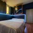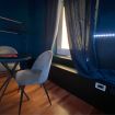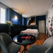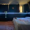 La suite è appartata e silenziosa, caratterizzata dalle pareti blu cobalto con boiserie, ampio angolo relax per il tea break.